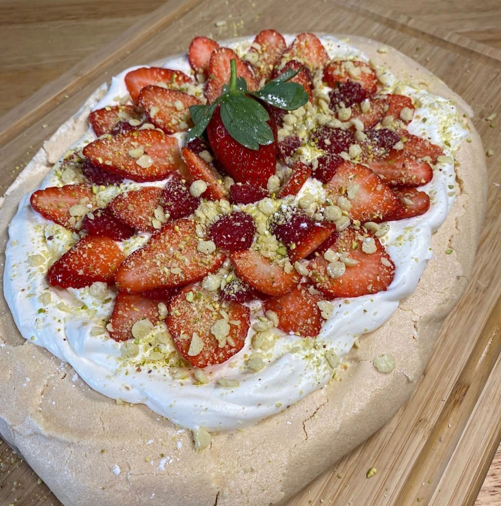 Meanwhile, whisk your double cream until it forms soft peaks. Spoon on to your cooled meringue and decorate with berries, sprinkle on some crushed pistachios and vegan chocolate shavings and enjoy!